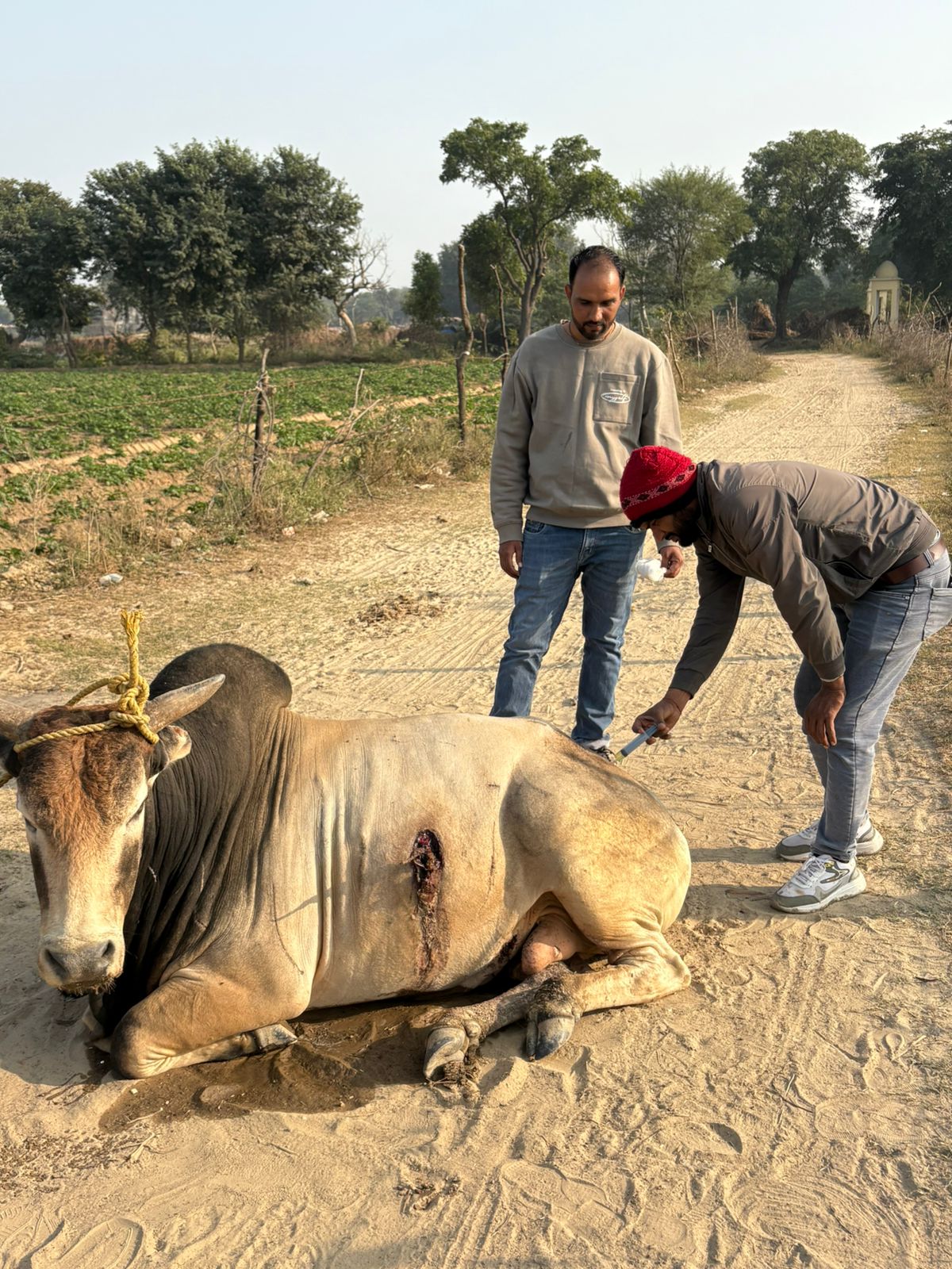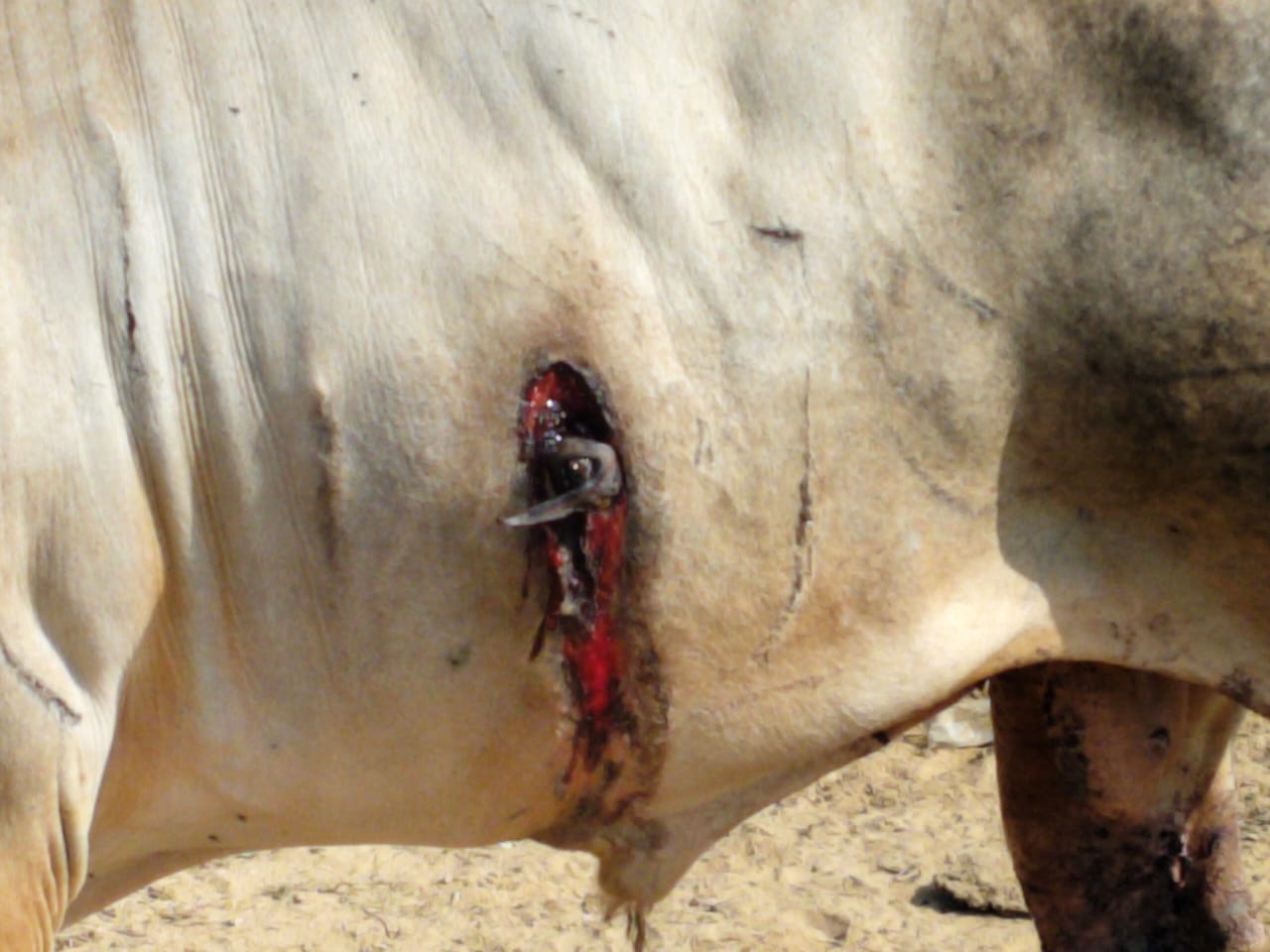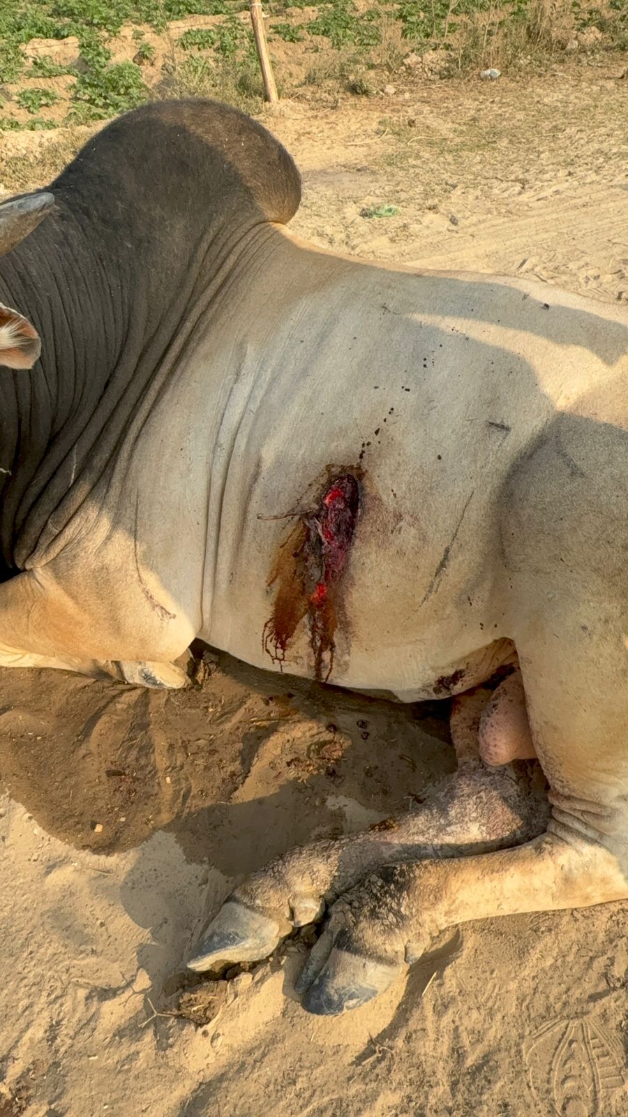 In a deeply painful and shocking incident, Ek Sankalp Trust rescued a huge and innocent Nandi Ji Maharaj, who was brutally attacked with a sharp-edged weapon. The cruelty was so severe that the weapon broke inside his stomach, leaving him in unbearable suffering.