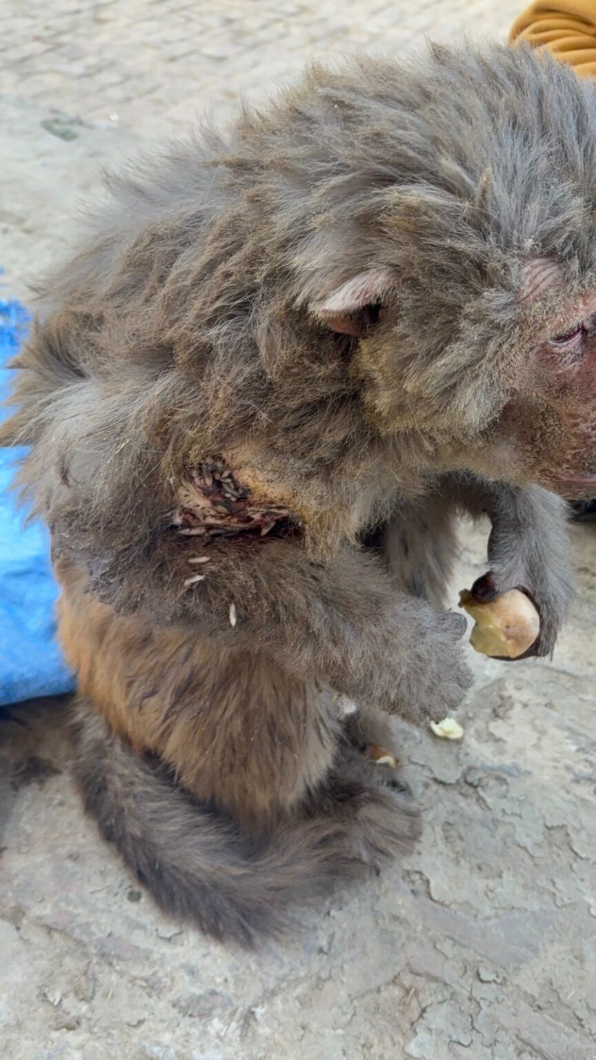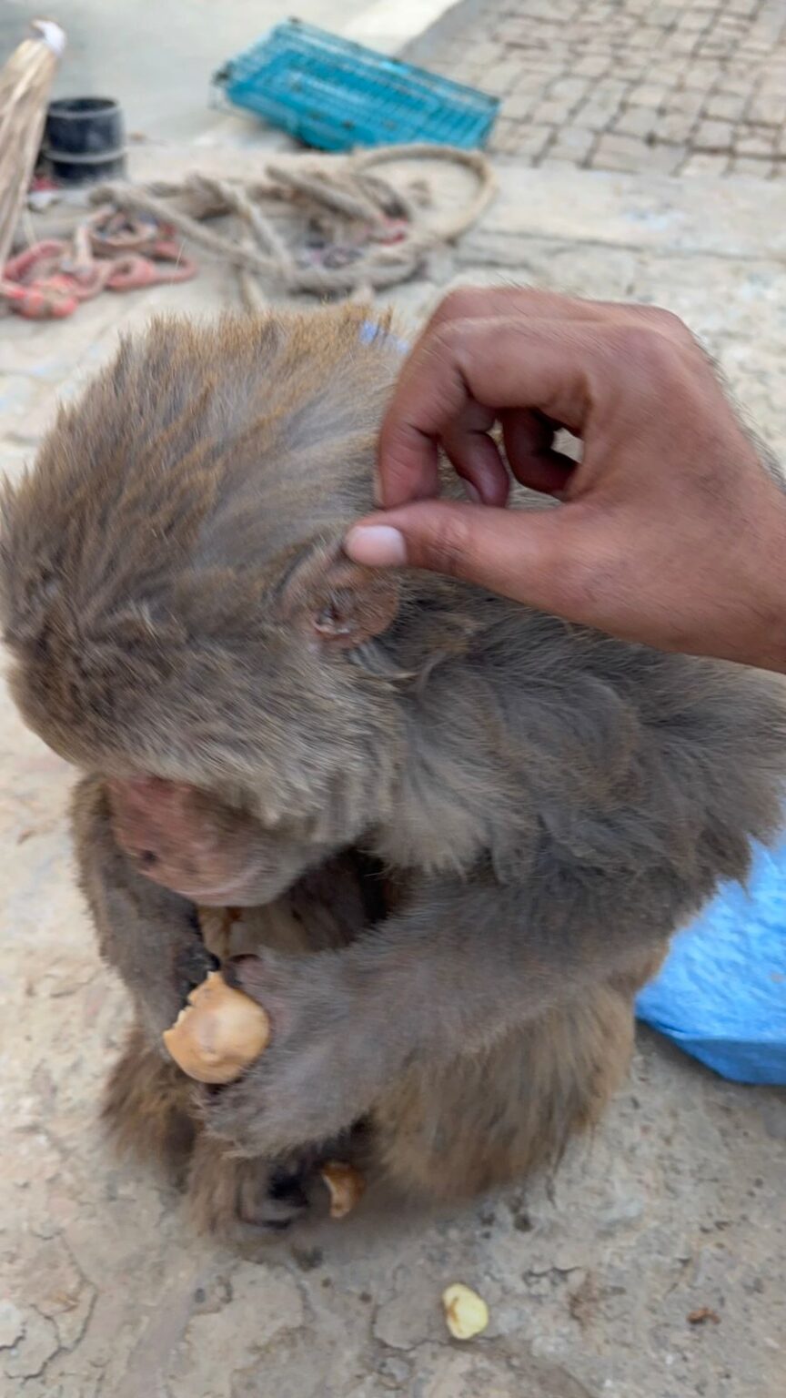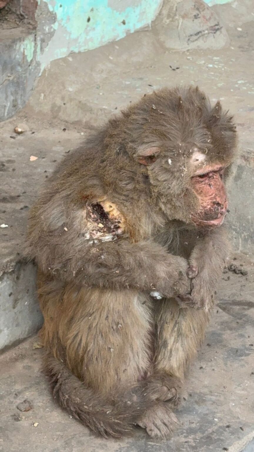 Today, in a dirty dump area, we rescued a blind Monkey (Vanar Maharaj) in an extremely painful and heartbreaking condition. His weak body was filled with maggots, deep wounds, and unbearable suffering. He was lying helpless… waiting for someone to save him.